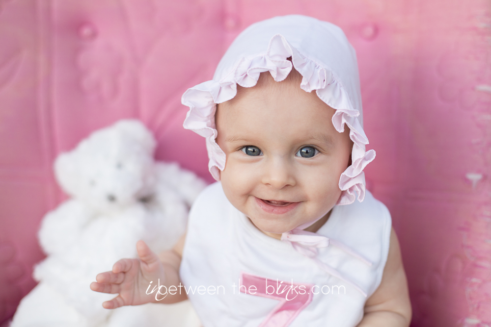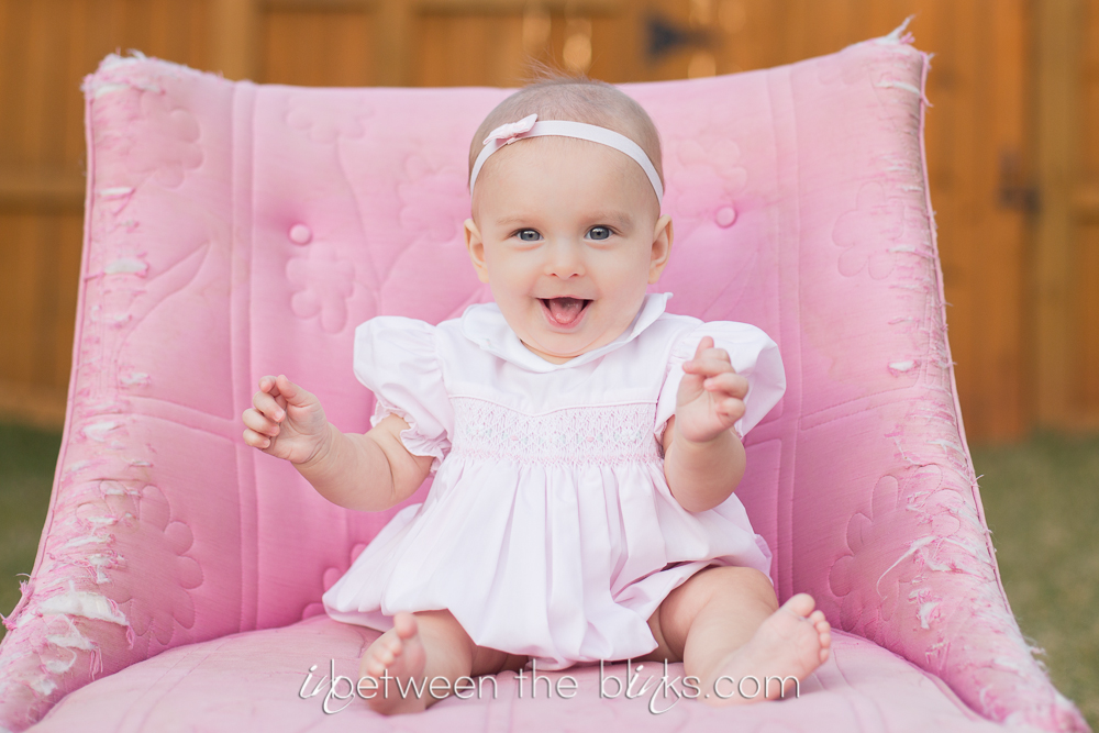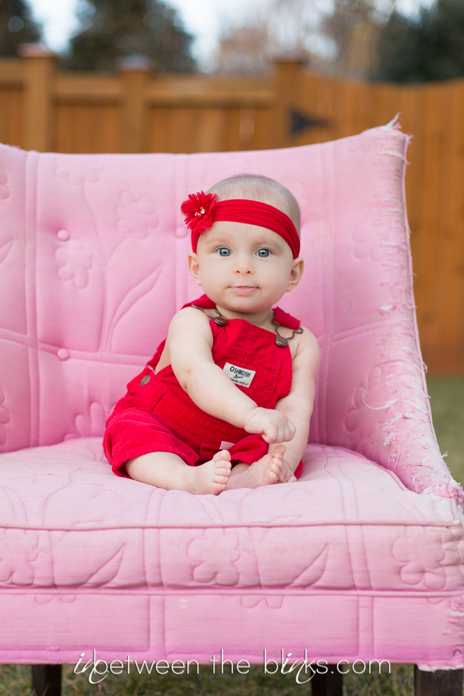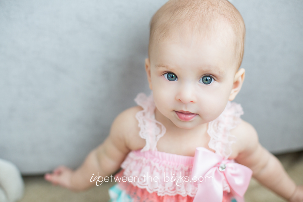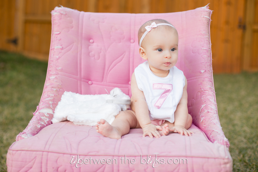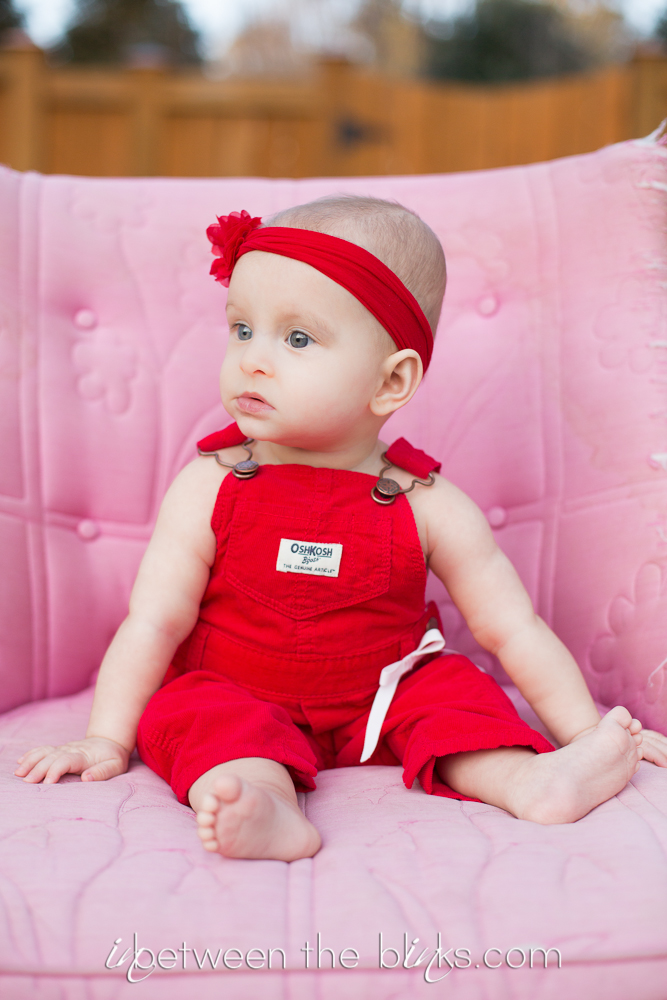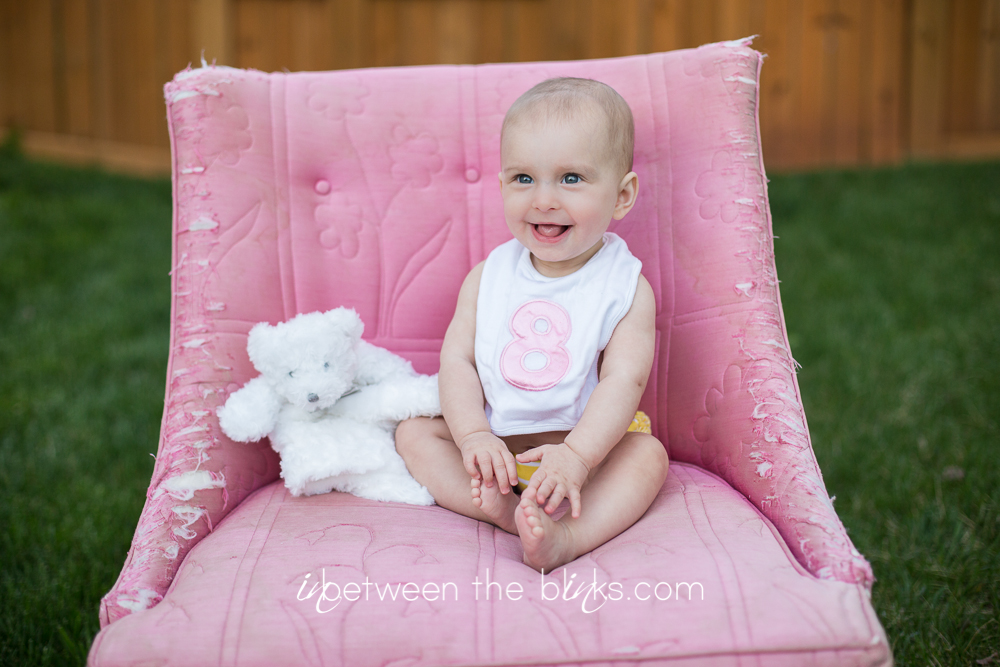 So I fell behind in posting Claire’s 7month photos so you get double the cuteness with a look at her seven and eight month photos! She really is getting so big!  She started sitting up on her own at about five and a half months. She’s just now starting to figure out the first steps to crawling. Which is a-ok with me.  I like not having to chase her around yet!