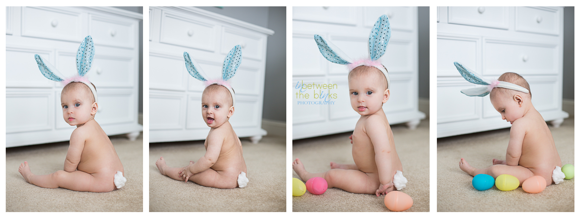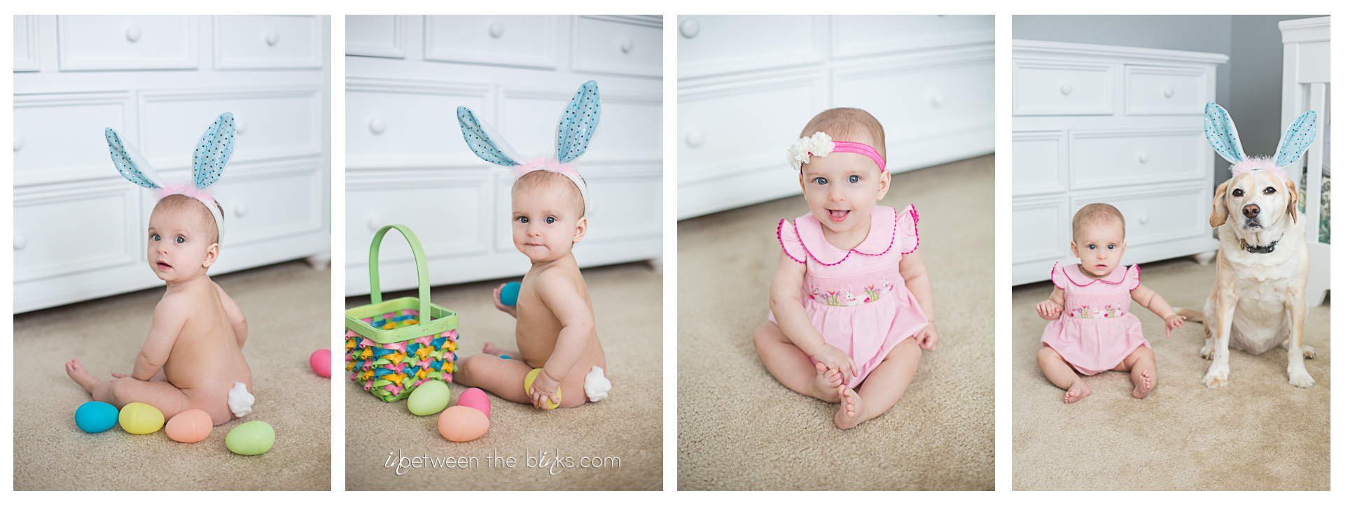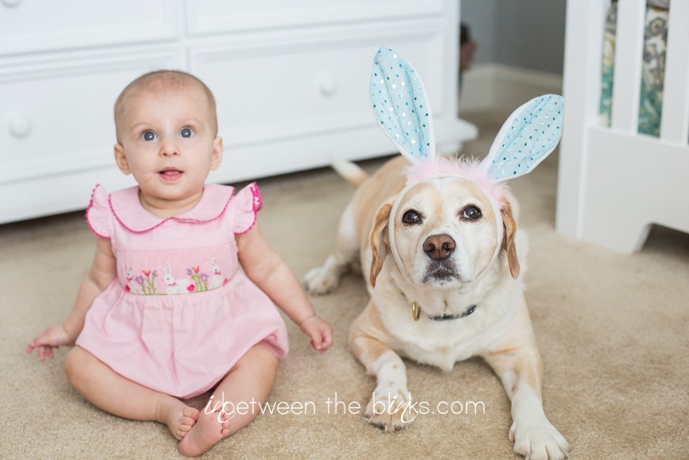 Child Easter Photo ideas:  I had a vision for a while for capturing Claire’s first Easter.  I’ve been scheming all kinds of photo sessions with her anxiously awaiting when she could sit up on her own.  It really has made photographing her so much more fun!  She can sit up and doesn’t need my help. And she’s not yet crawling so I have pretty much endless time to play and get the shot I want!  I could not be happier or more giddy about her Easter Bunny photos!  A few cotton balls, some plastic Easter eggs and bunny ears.  Oh and one cute bare-bottomed baby!  Photo gold!  I hope you enjoy this cute series! Baxter even got in on the action!  Trust me…this is HUGE for him.