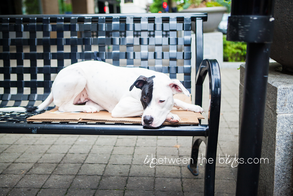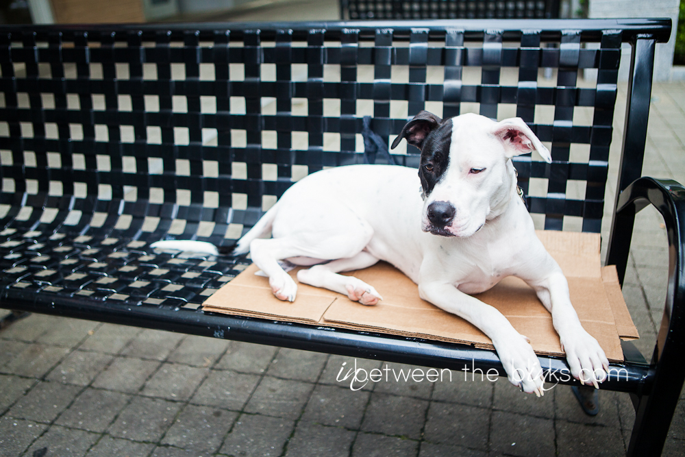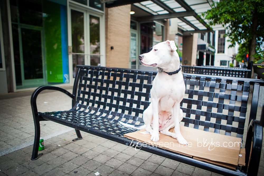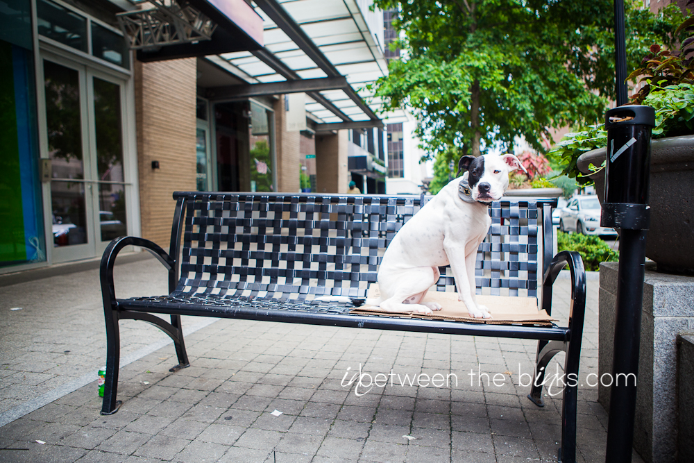 One year ago, June 18, 2012 I found a puppy sleeping on a bench in downtown Raleigh. A year later, she is my wild princess that has brought joy, chaos and a crazy amount of love into my life. I knew from the day I officially chose to adopt her and make her a permanent addition to the family, that I would bring her back to the downtown bench for a commemorative photo shoot. I waited a few days after June 18th for a Sunday when downtown wouldn’t be so crowded. It was overcast, just like the day I found her. I’m so glad I saw this little pudgy girl while working one morning in downtown. Two dogs are SO much more than one. And although I joke with my friend that considered adopting Lily in the begining that she dodged a bullet (a panty/bra-eating, counter-surfing, horrible potty-training, mischievous bullet), I wouldn’t trade her for the world. I also love the fact that Lily attracts so much attention wherever we go. People just fall in love with her. Eventually somebody asks, “is she a pit bull?” I smile and say yes, and there’s never another word said about her possible genealogy (pretty sure she’s a boxer/American bulldog mix). My mom was worried when I told her I was going to adopt a “pit bull,” but within the first meeting, Lily won her over. Good girl Lily, good girl.