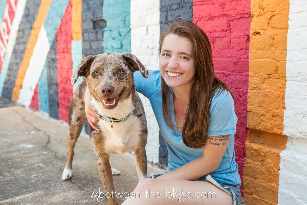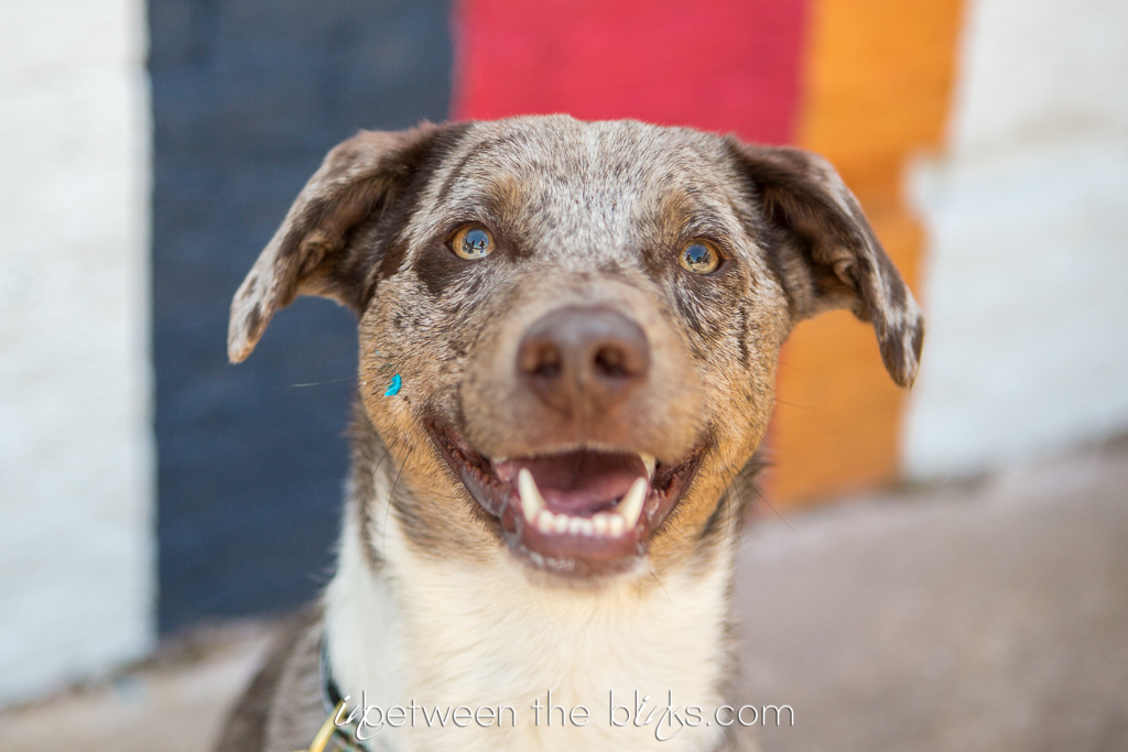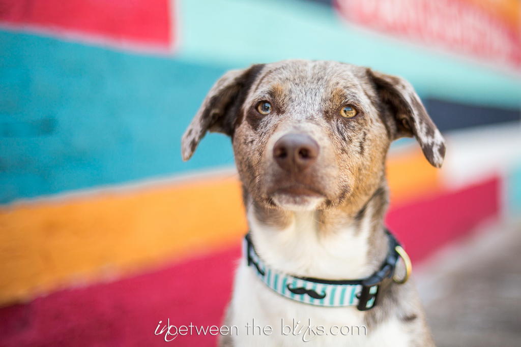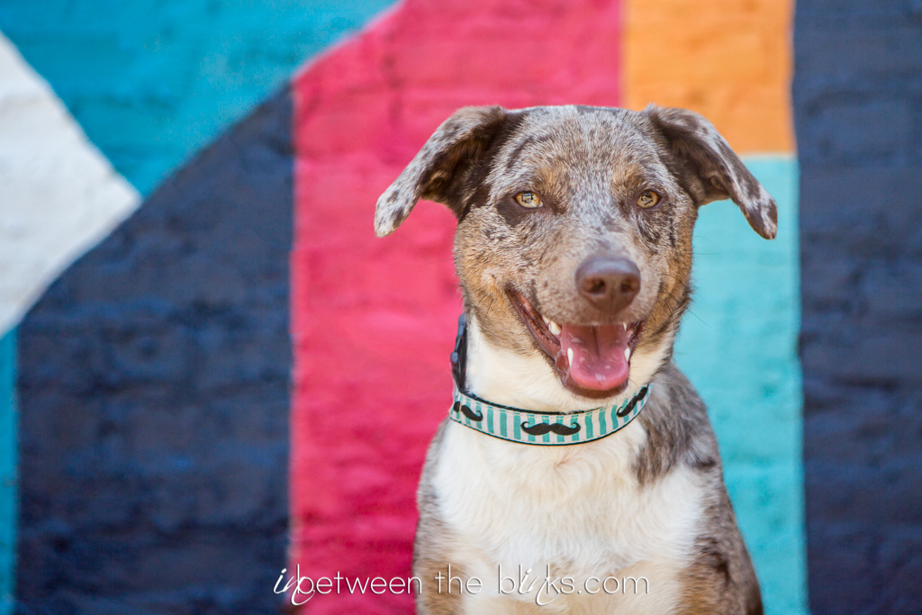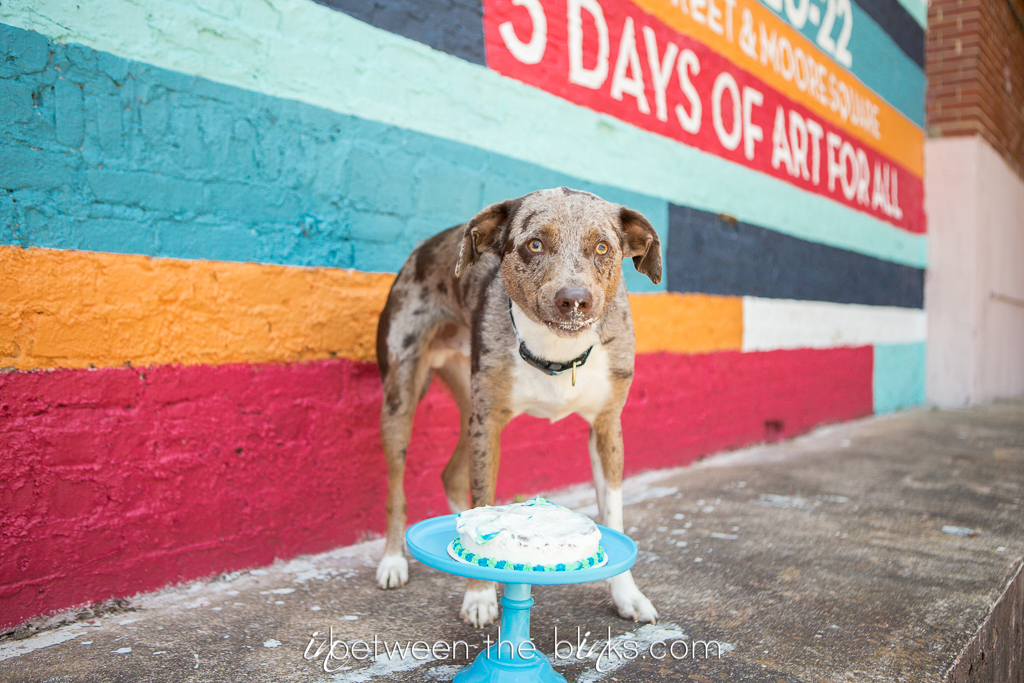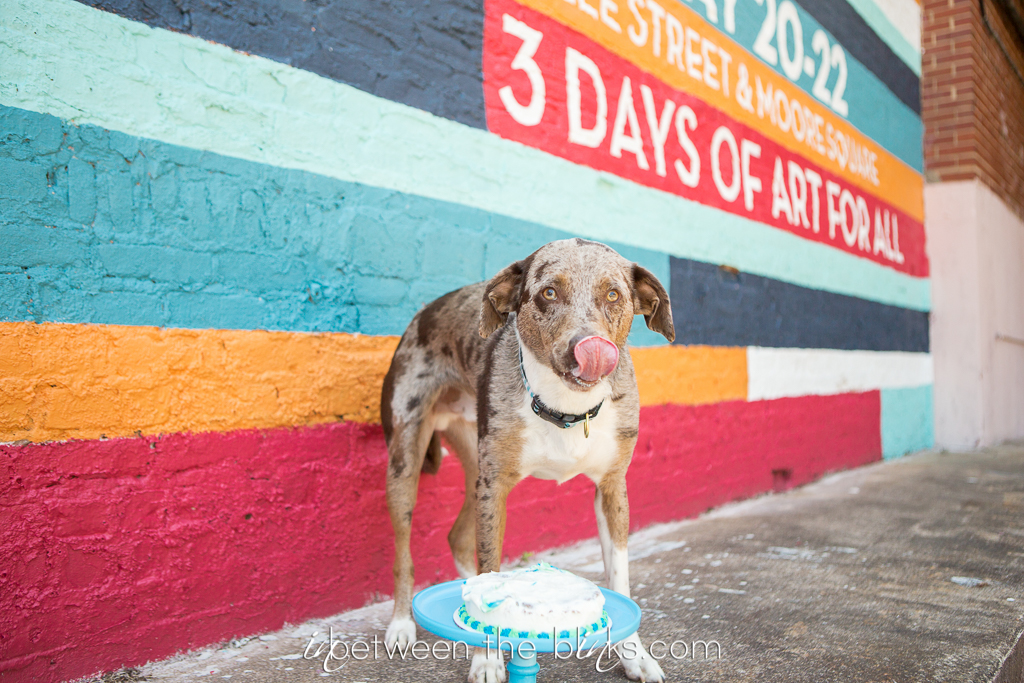 Happy Birthday Anubis! This rescue pup is officially two years old and somehow manages to get cuter and cuter. Anubis celebrated his doggie birthday in downtown Raleigh late this spring. I was so excited to find this bright, bold mural to match his bright personality! It was the perfect backdrop for this silly pup. I’ve photographed Anubis several times since he first hit the jackpot with his mama Jheri. He loved his cake from Gourmutt’s Bakery and was pretty tidy in eating it. Although he did manage to get a tiny sliver of blue icing on his cheek at the end which just make his “derp” face that much derpier. You’ll know which photo I’m talking about as soon as you see it!
