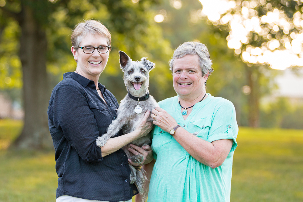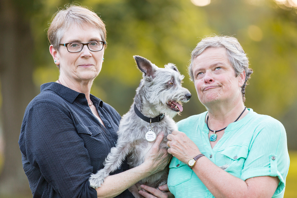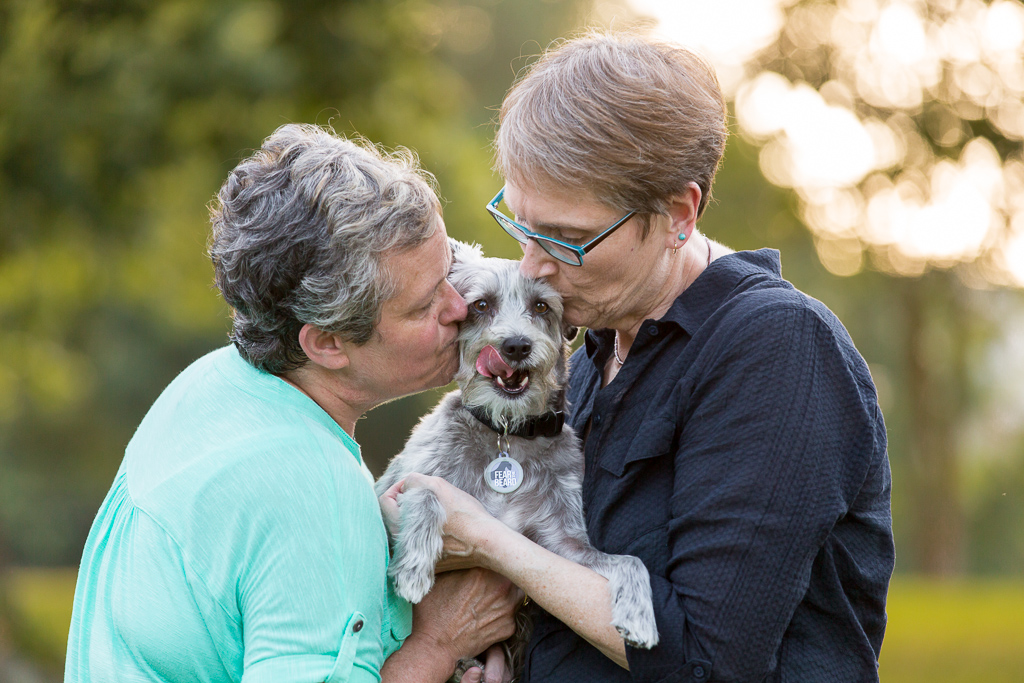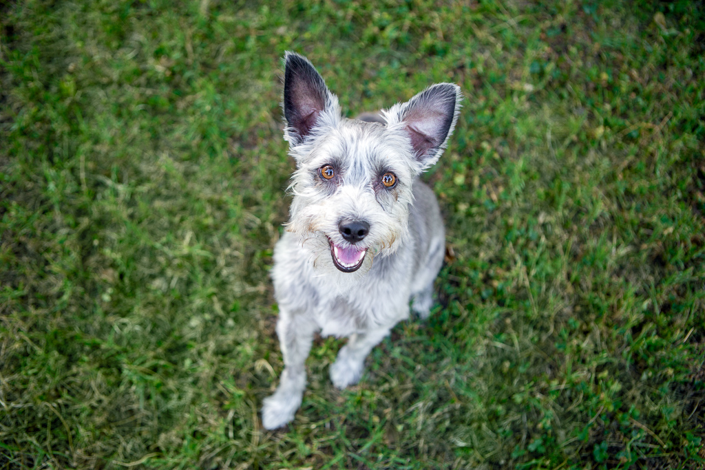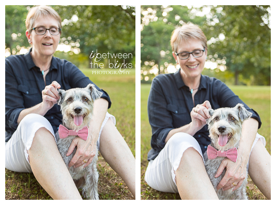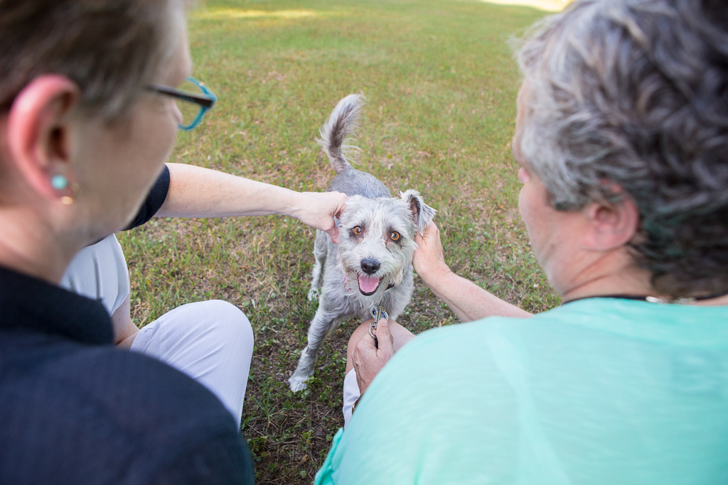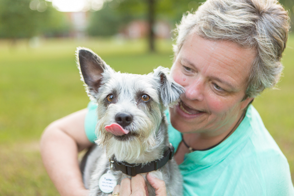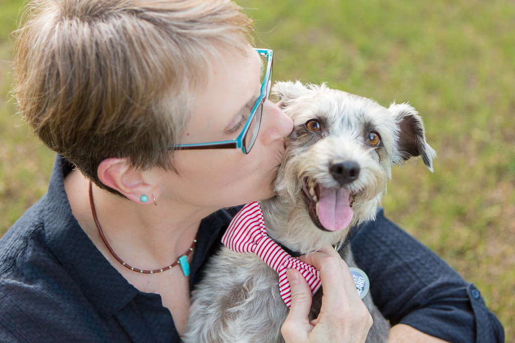 Ann says, “he had a mischievous look in those big brown eyes. His bio said he was a schnoodle (schnauzer/poodle mix) —I have more poodle in me than he does !!! We also loved his one droopy ear. When we met him he was very scruffy and very cute. He also escaped from us as the leash broke, so we had to take him. We figured out he has jack Russell in him, but, we don’t talk about that side of the family.”